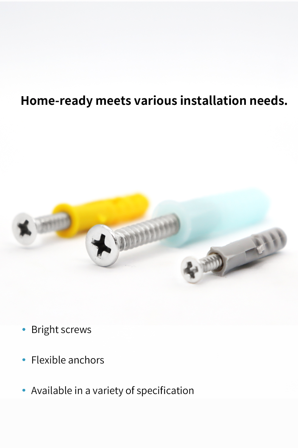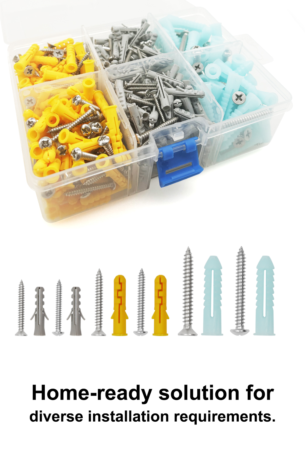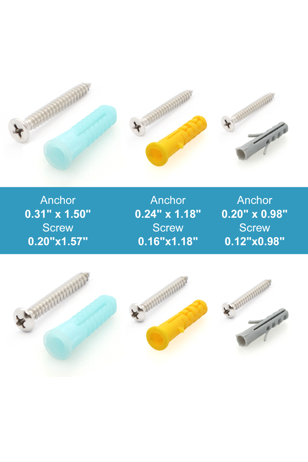 [Screws with anchors drywall set] Includes 216 drywall screws and 216 drywall anchors. Offering anchor sizes of 0.20" x 0.98", 0.24" x 1.18", and 0.31" x 1.50", paired with corresponding screws of 0.12"x0.98", 0.16"x1.18", and 0.20"x1.57".