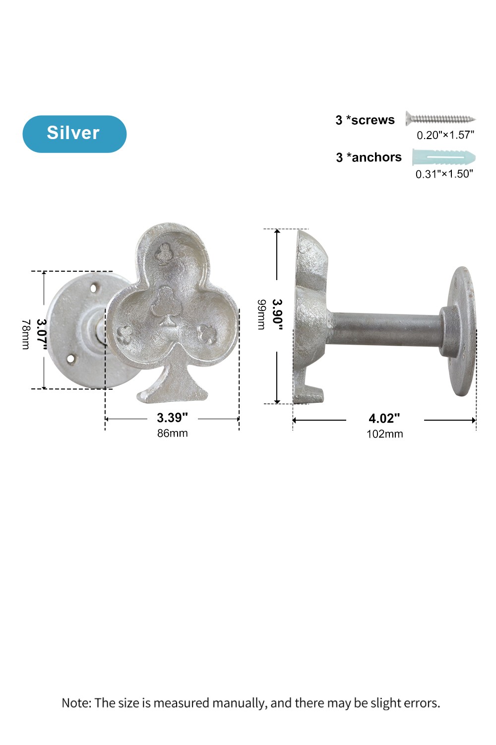 [Measurements] Clubs shape: 3.9"H x 3.39"W, Total length from wall: 4.02". Base diameter: 3.07". Weighs 1.1 lbs. Includes 3 screws & expansion anchors for easy installation.