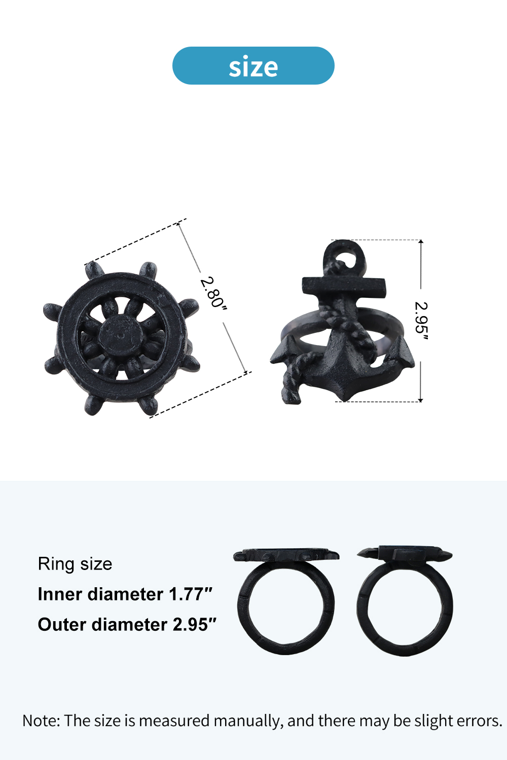 [Packing & Overall Size] This set includes two nautical-style napkin rings: one anchor-shaped (2.95″ L × 2.44″ W) and one rudder-shaped (2.8″ diameter). Each ring has an inner diameter of 1.77″ and an outer diameter of 2.95″, fitting most napkins with ease