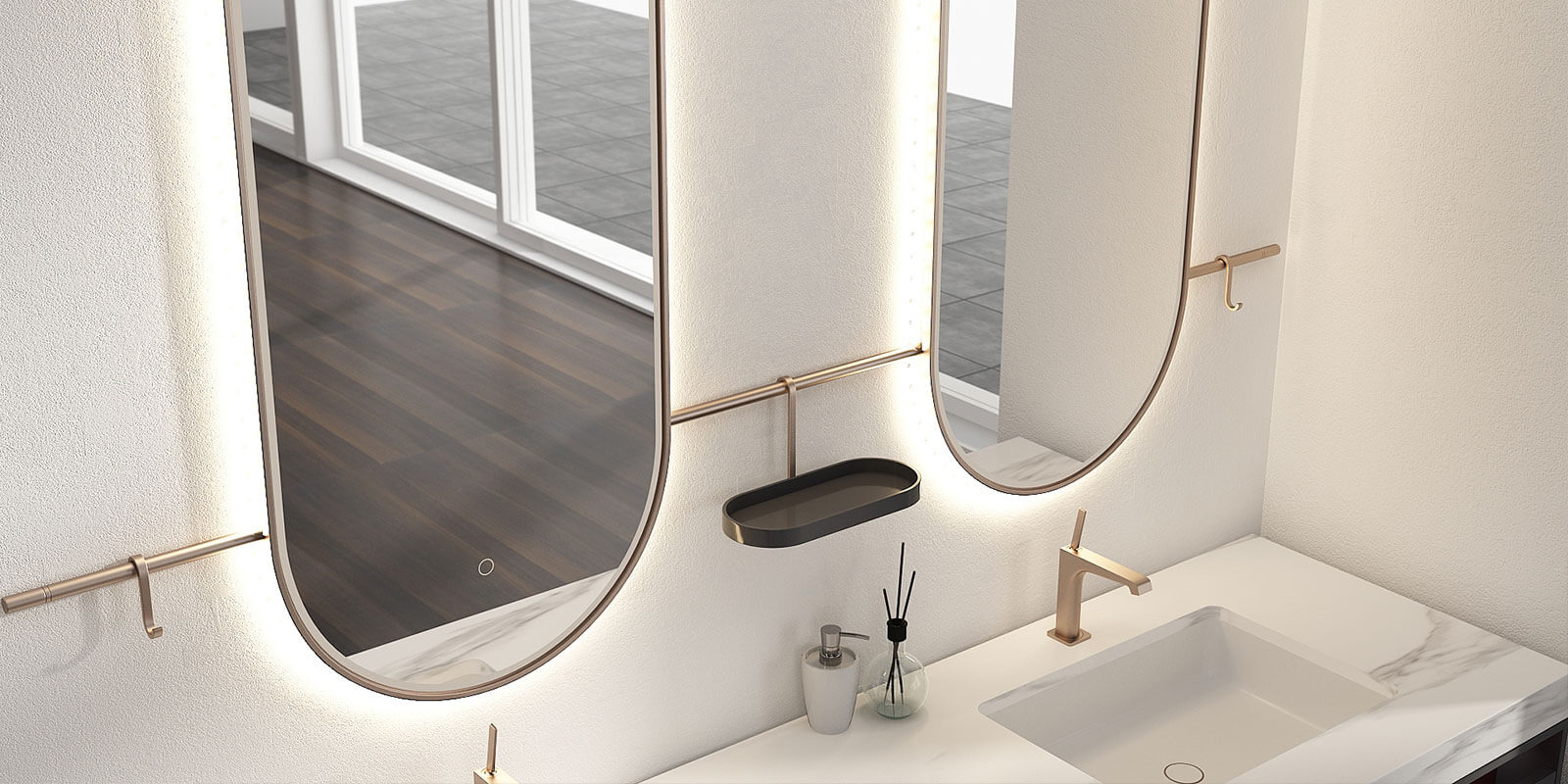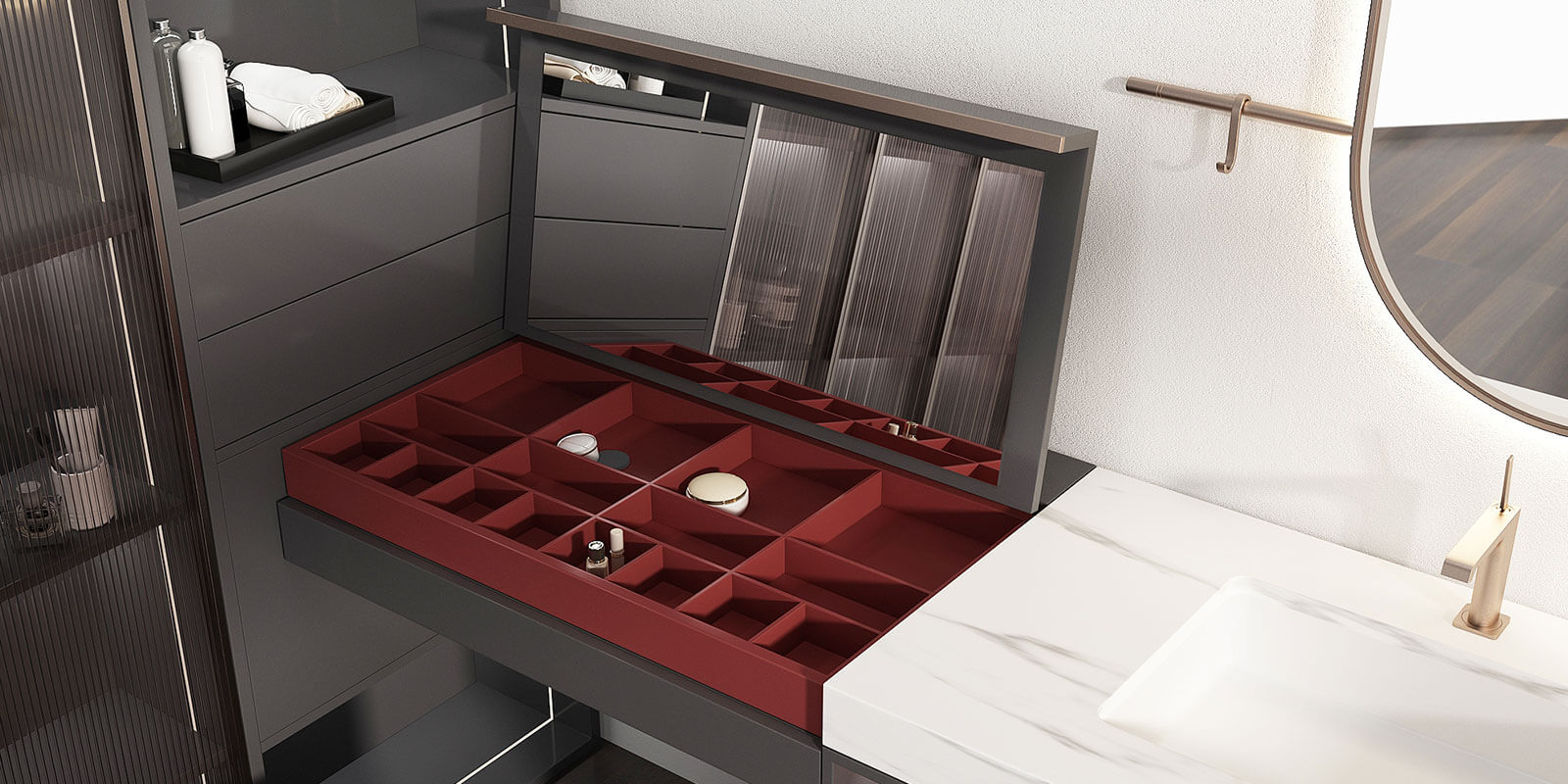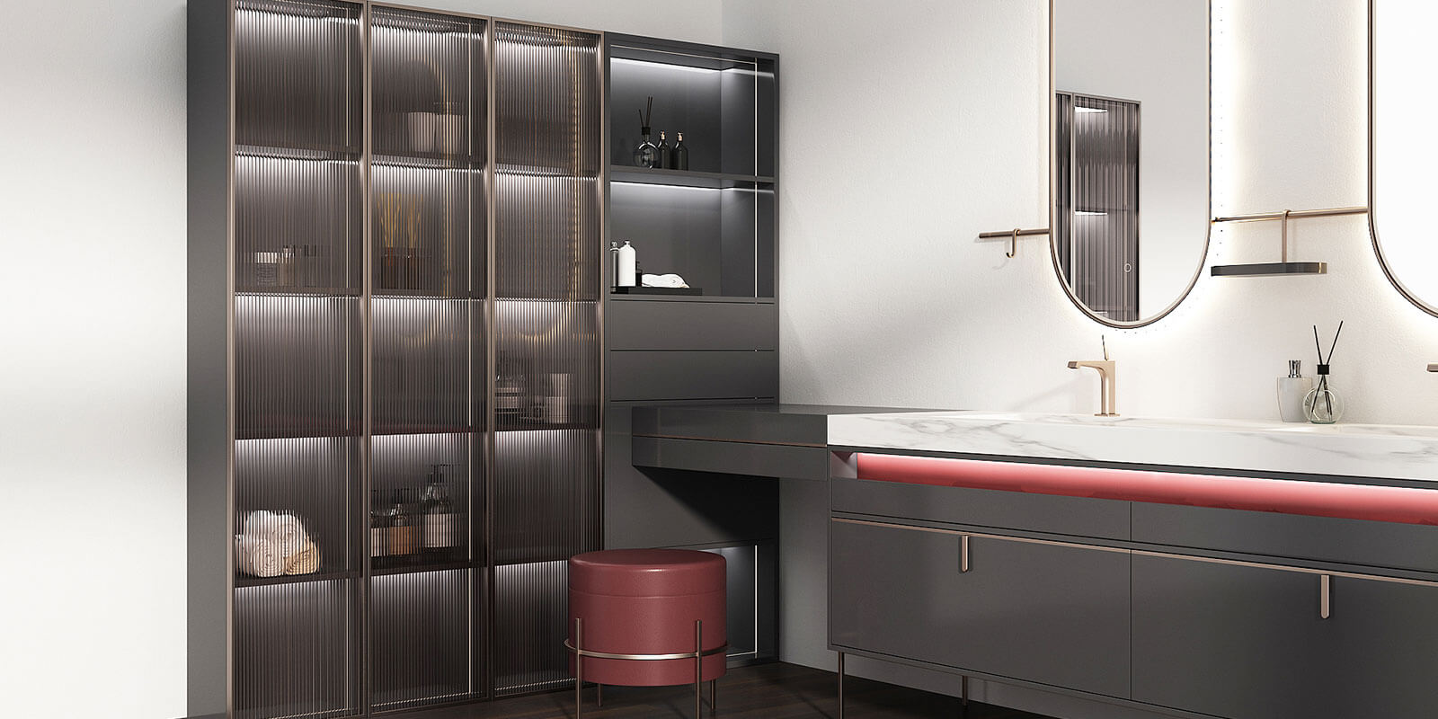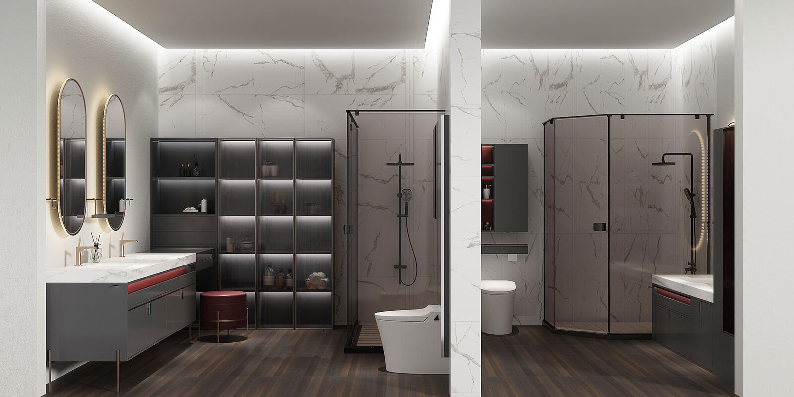 金色線條、拉手與柜腳搭配,打造出古今碰撞、有國潮特色的衛(wèi)浴空間。